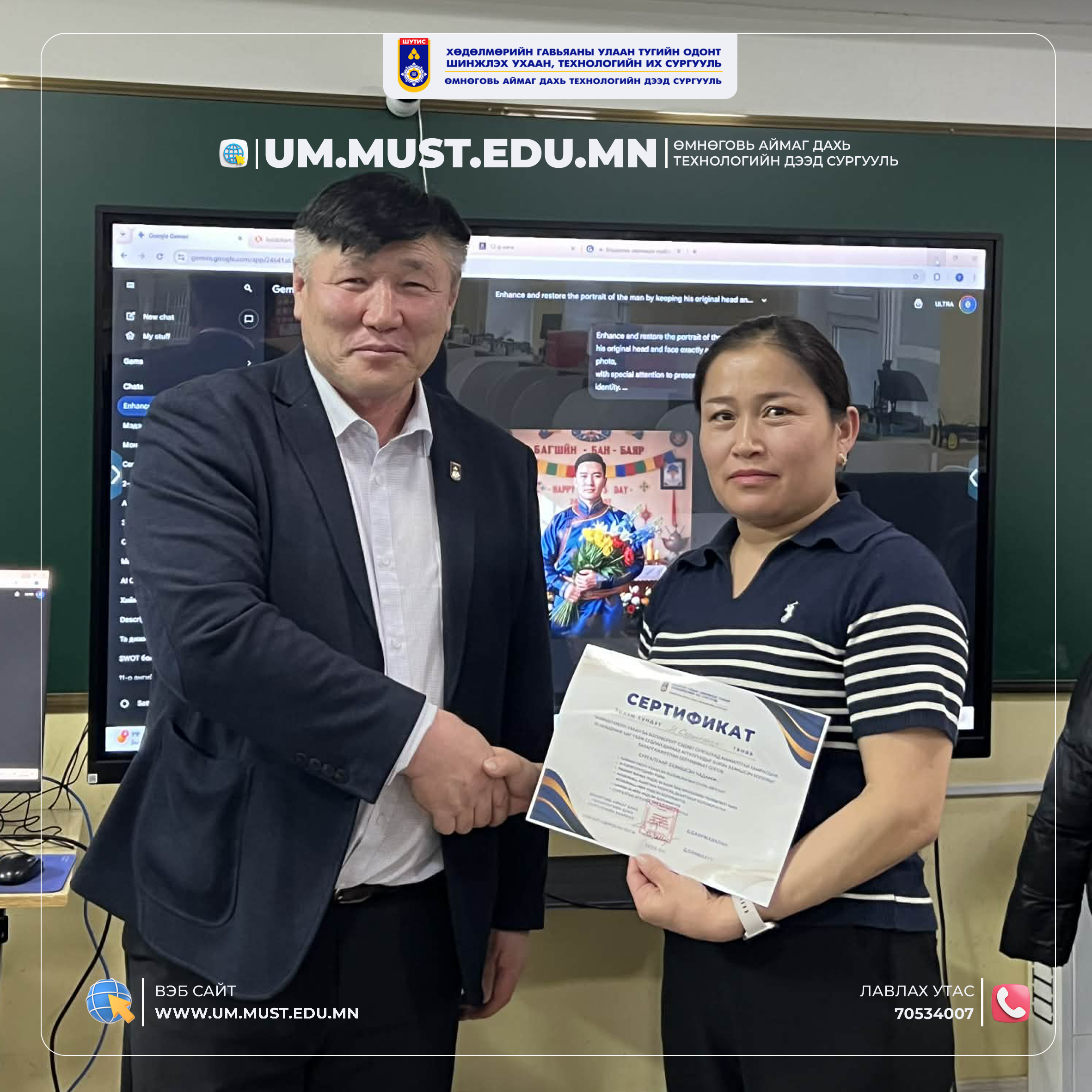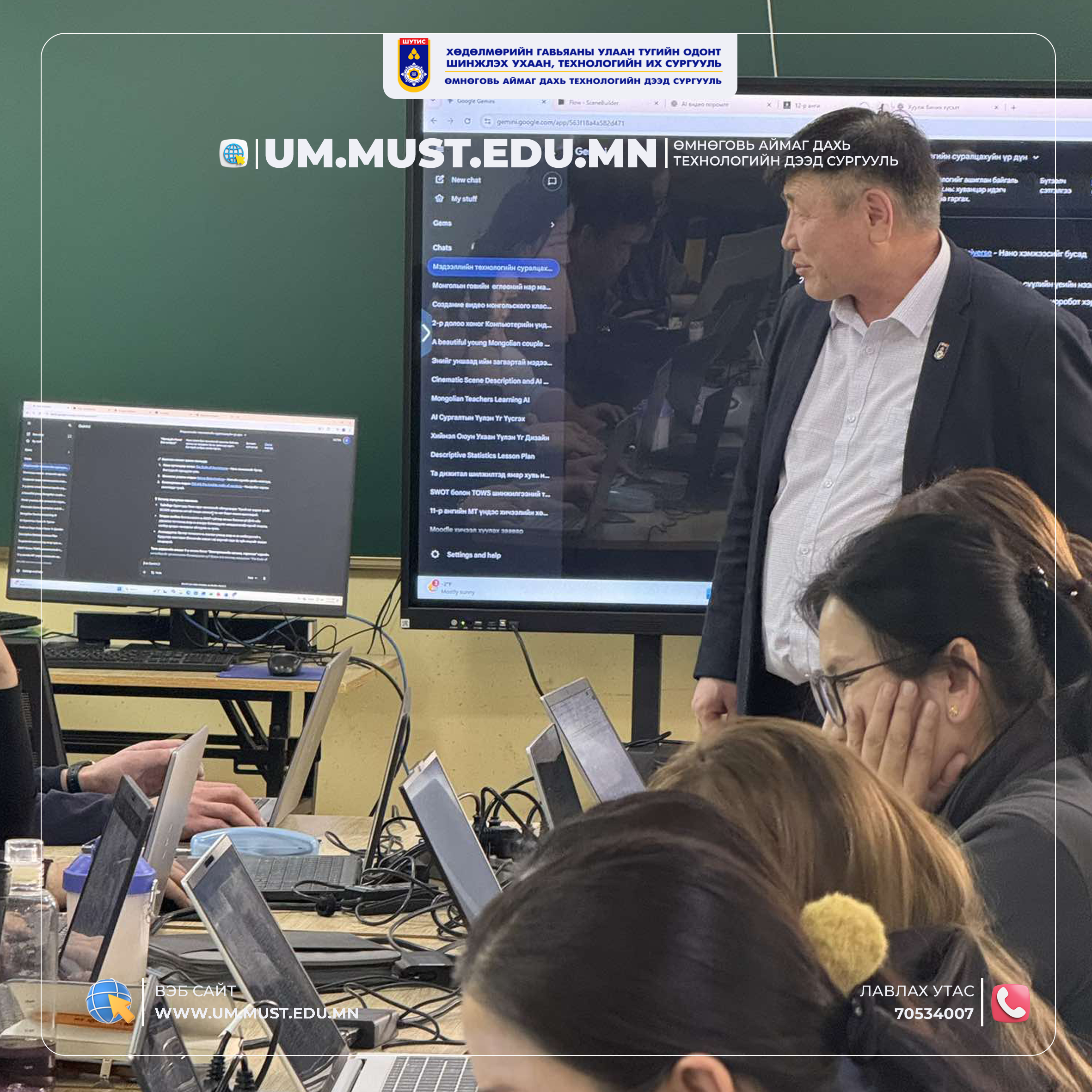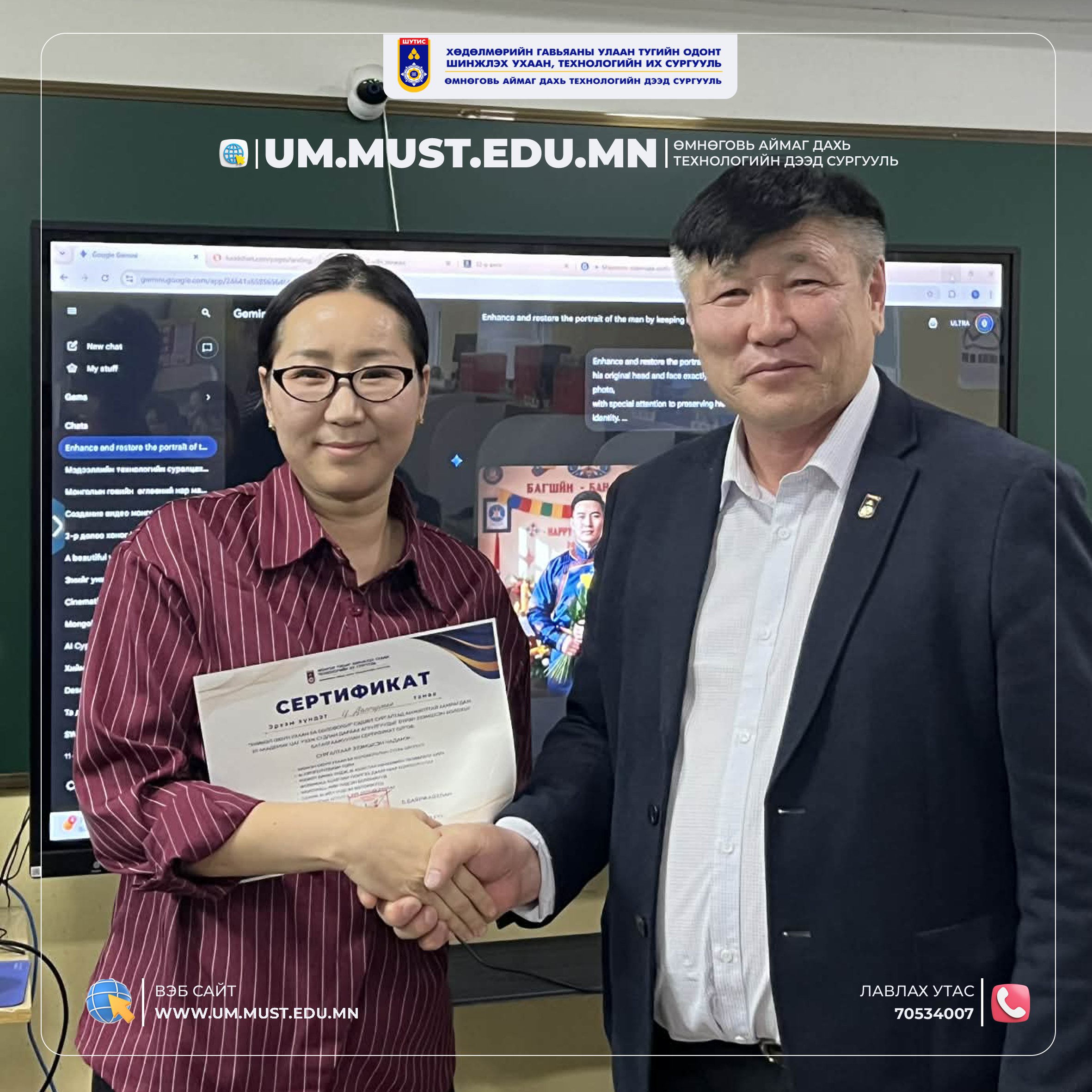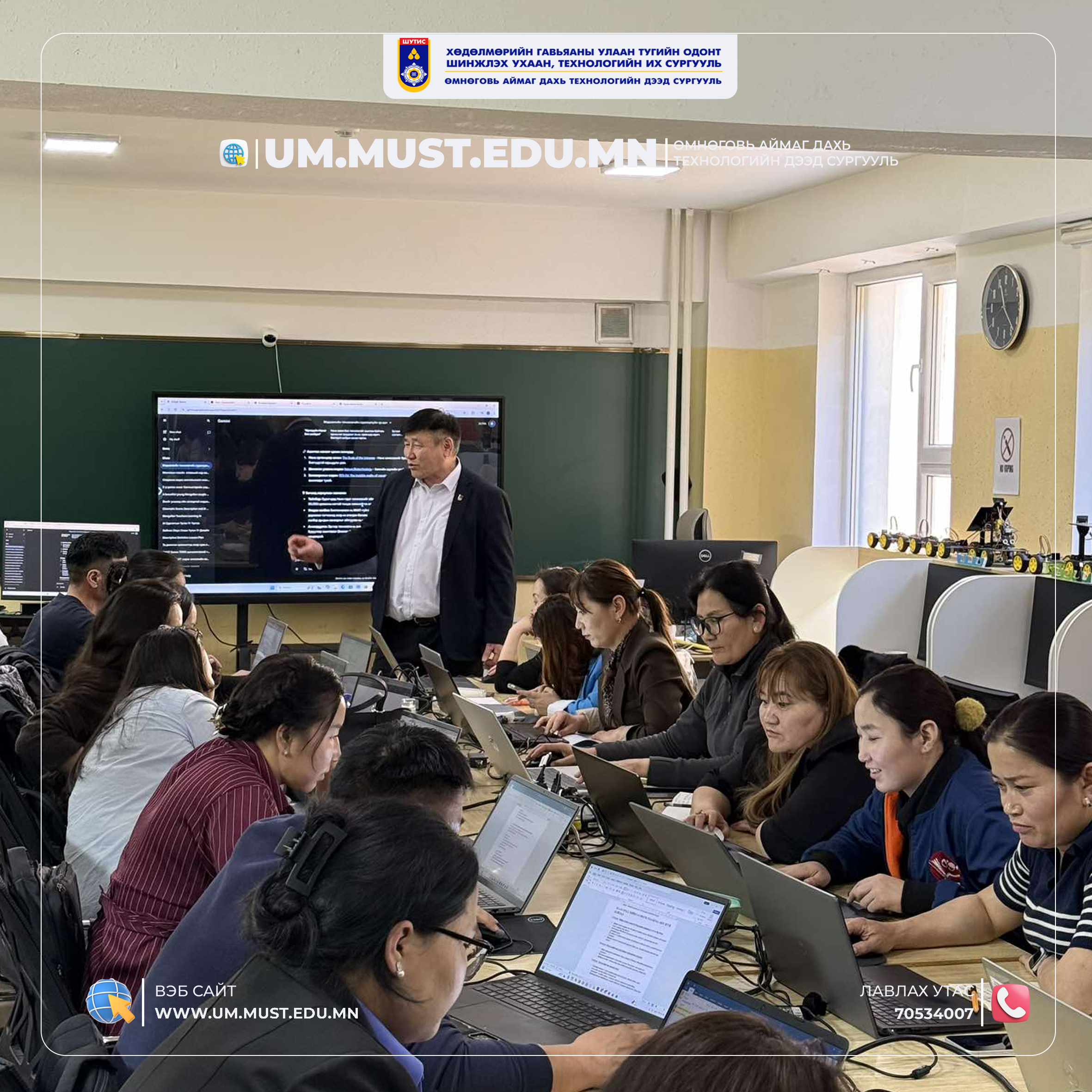 Өмнөговь аймгийн боловсролын салбарын хөгжил, багш нарын мэргэжлийн ур чадварыг дээшлүүлэх зорилготой лицензтэй программ хангамжийг сургалтын үйл ажиллагаанд нэвтрүүлэх төслийн хүрээнд Өмнөговь аймгийн Боловсролын газар-тай хамтран “AI ба боловсрол” сэдэвт сургалтыг амжилттай зохион байгууллаа.